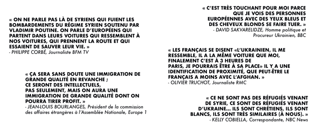 Les internautes l’ont relevé sur les réseaux sociaux, les réfugiés Ukrainiens et les migrants du Moyen-Orient n’ont pas droit au même traitement dans les médias. Et ce, qu’il s’agisse des propos tenus par Jean-Louis Bourlanges, Philippe Corbé, Olivier Truchot, Kelly Cobiella ou encore David Sakvarelidze, mais aussi des titres de l’actualité. Quand on parle des Ukrainiens, on peut lire les mots “accueil” ou encore “nouvelle vie”. Lorsque l’on parle des Afghans, des Syriens ou encore des Libanais, on va trouver des termes comme “barricade” ou “crise”.