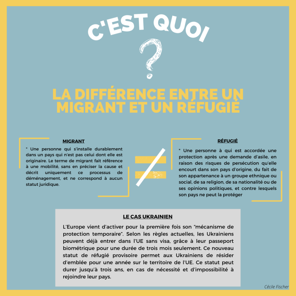 En comparaison, l’Etat français a mis en place au moins 100 000 places pour accueillir les réfugiés Ukrainiens alors qu’en août dernier le Président de la République, Emmanuel Macron avait déclaré « anticiper et se protéger contre des flux migratoires irréguliers importants » suite à l’arrivée de migrants de pays en guerre comme la Syrie ou encore l’Afghanistan.